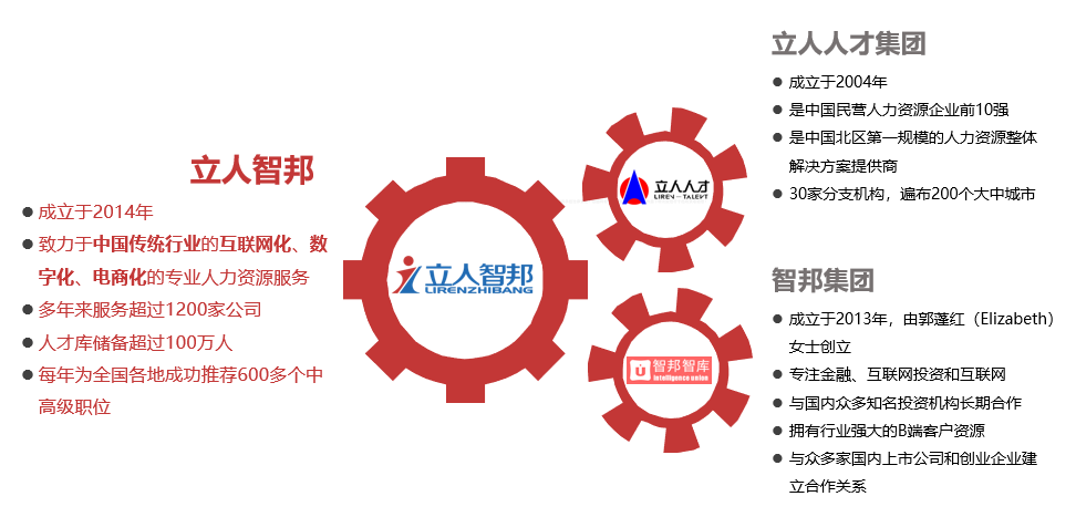 立人智邦成立于2014年,是由立人人才集團(tuán)與智邦人力集團(tuán)強(qiáng)強(qiáng)聯(lián)手共同組建,這兩家公司在業(yè)內(nèi)都具有十余年獵頭經(jīng)驗(yàn)的著名獵頭公司。立人人才集團(tuán)成立于2004年,是中國民營人力資源企業(yè)前10強(qiáng),也是中國北區(qū)第一規(guī)模的人力資源整體解決方案提供商。立人人才集團(tuán)擁有30家分支機(jī)構(gòu),遍布200個(gè)大中城市。立人人才集團(tuán)組織架構(gòu)為事業(yè)部制,外包事業(yè)部、獵頭事業(yè)部(立人智邦)、管理咨詢事業(yè)部、互聯(lián)網(wǎng)+事業(yè)部。智邦集團(tuán)成立于2013年,由郭蓬紅(Elizabeth)女士創(chuàng)立,在創(chuàng)業(yè)初期以專注互聯(lián)網(wǎng)投資和互聯(lián)網(wǎng)被投企業(yè)提供人才服務(wù)為主線,同時(shí) 探索二三級城市傳統(tǒng)行業(yè)為輔線。智邦集團(tuán)與國內(nèi)眾多知名投資機(jī)構(gòu)長期合作,擁有行業(yè)強(qiáng)大的B端客戶資源。目前已與眾多家國內(nèi)上市公司和創(chuàng)業(yè) 企業(yè)建立合作關(guān)系,并成就了優(yōu)秀人才的職業(yè)發(fā)展。